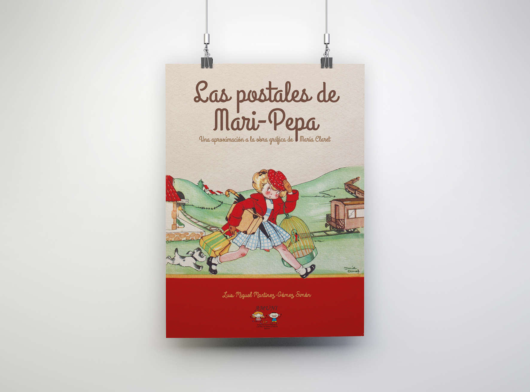 Diseño de la portada para el libro ‘Las postales de Mari-Pepa, una aproximación a la obra gráfica de María Cloret’ de Luis Miguel Martínez-Gómez Simón. Un acercamiento a la obra gráfica de la ilustradora María Claret Abadal (1916-1986) por medio de la difusión de las imágenes contenidas en su vasta colección de tarjetas postales infantiles, en especial las dedicadas al personaje por el que será más reconocida, la niña Mari-Pepa Mendoza.