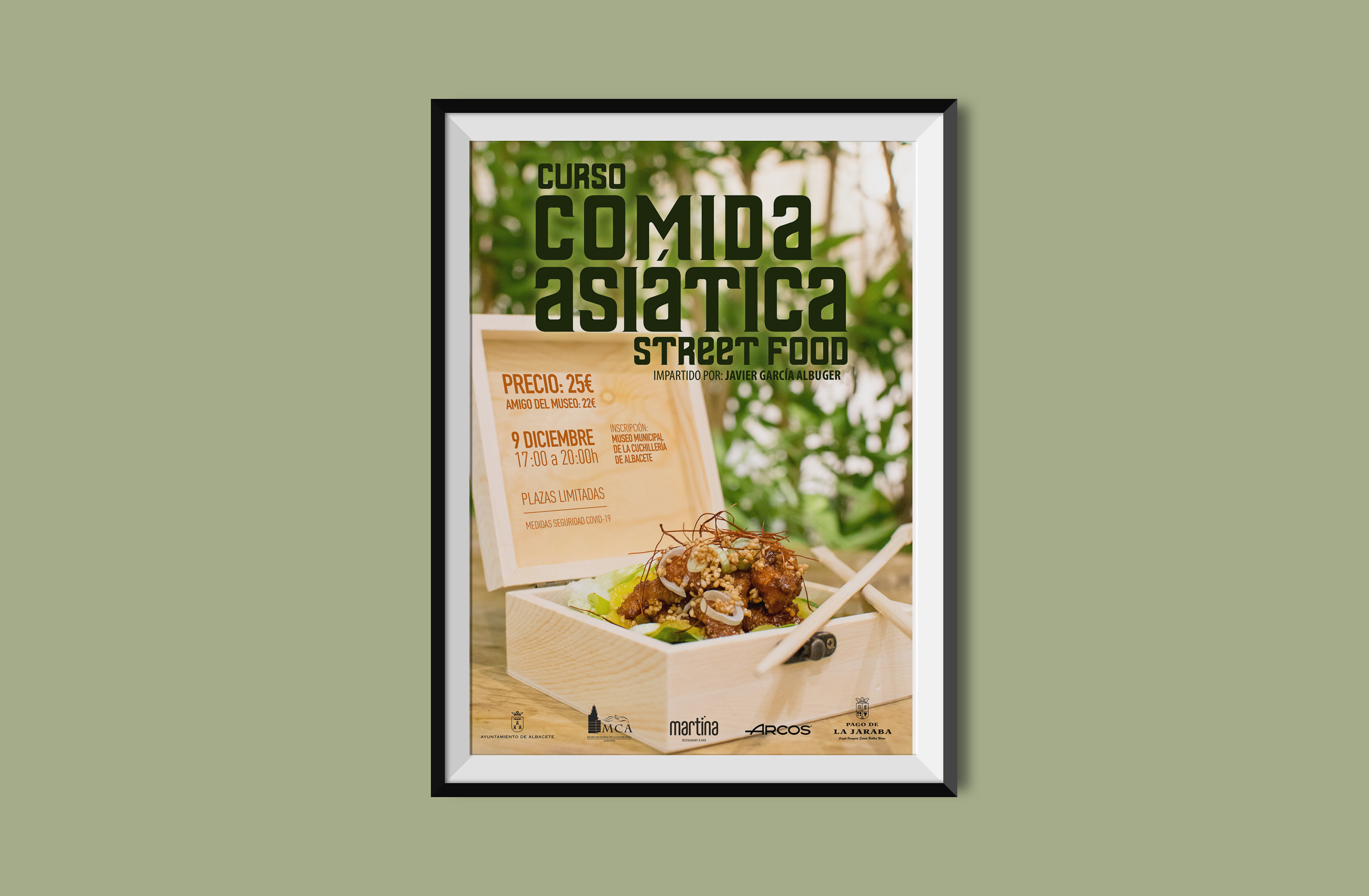 Diseño cartel para promocionar un curso organizado por el Museo de la Cuchillería de Albacete sobre comida asiática, centrándoselas en comida callejera y pequeños aperitivos. Curso impartido por el chef del restaurante Martina, Javier García Albuger.