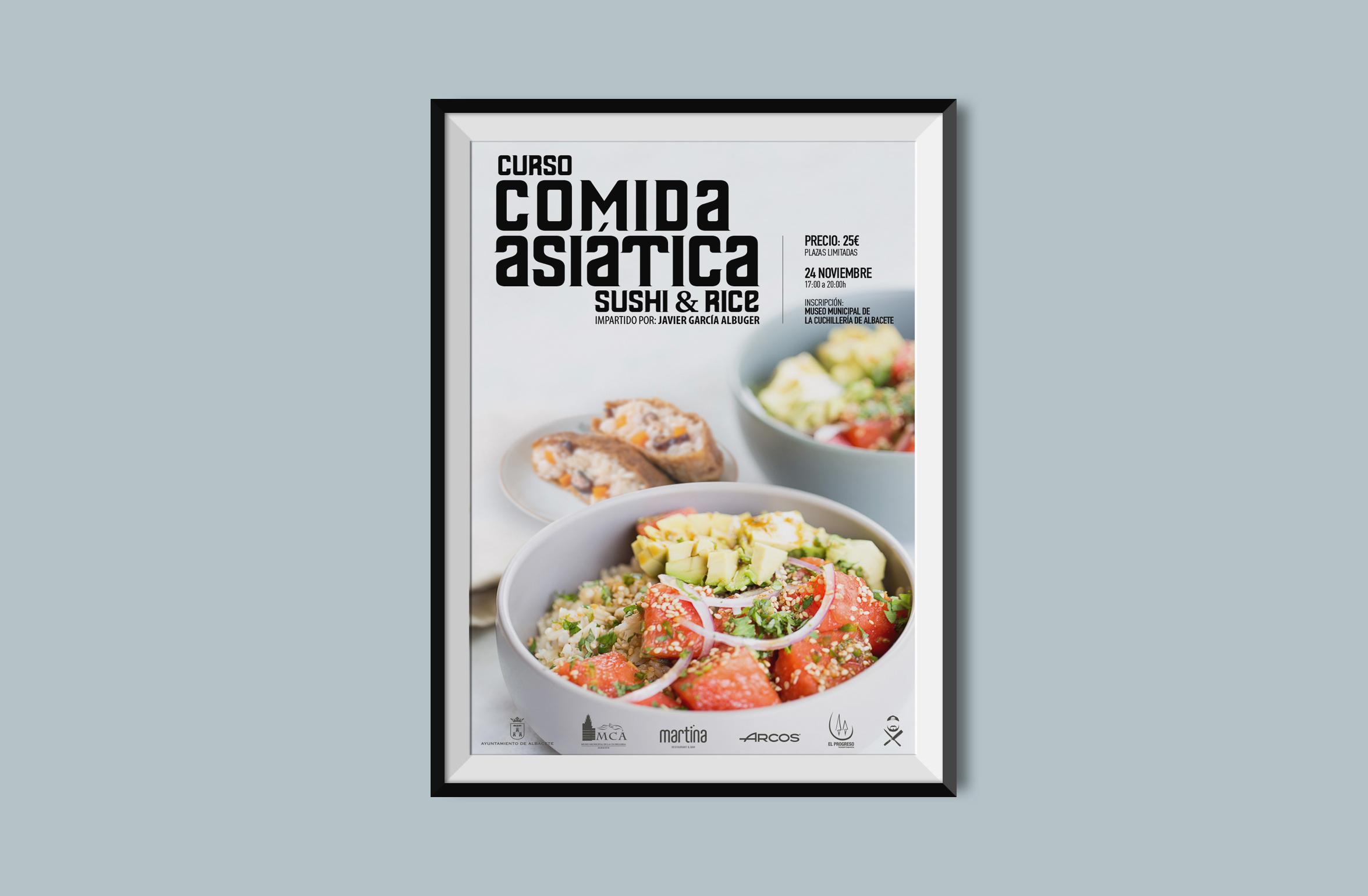 Diseño cartel para promocionar un curso organizado por el Museo de la Cuchillería de Albacete sobre comida asiática, principalmente la preparación de sushi y arroz. Corso impartido por el chef Javier García Albuger.