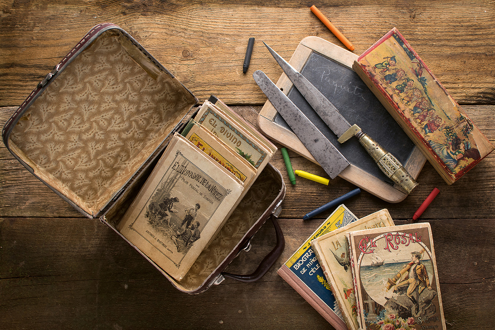 Composición de bodegones y fotografías para el catálogo Tesoros del Ayer de Javier Conde Cadena. Para la realización de estos bodegones se utilizaron, además de las piezas destacadas de cada categoría, objetos antiguos y de colección que también son propiedad del coleccionista. Cada una de estas fotografías se utilizaron para las portadillas de cada capítulo del catálogo.